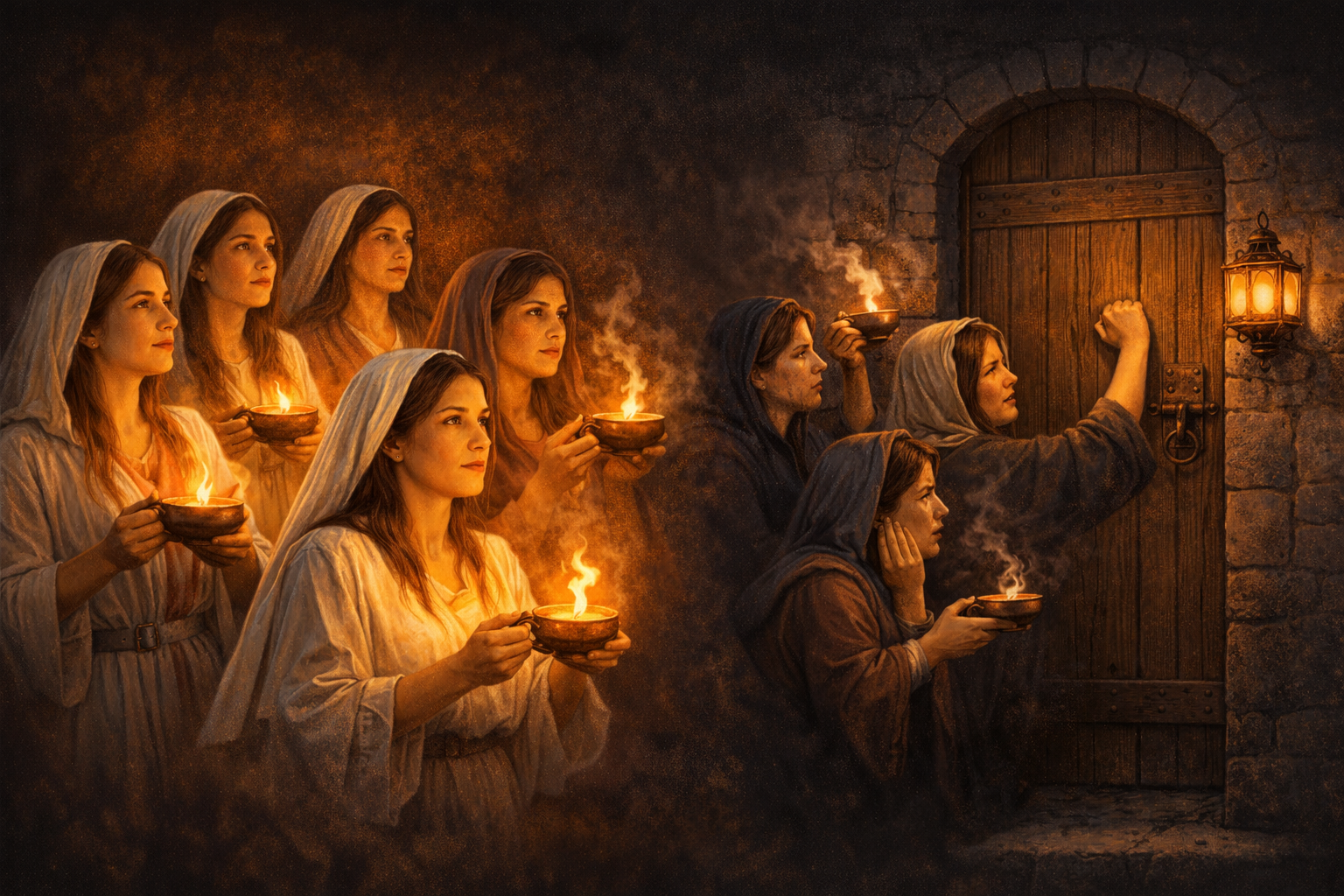 Lembre-se que o noivo ainda não voltou, mas logo virá, compre azeite enquanto é tempo e reacenda a lamparina que um dia veio a apagar, para que assim o noivo te encontre vigilante, e que ao invés de uma porta fechada, você entre com todos para festejar juntamente com o noivo.